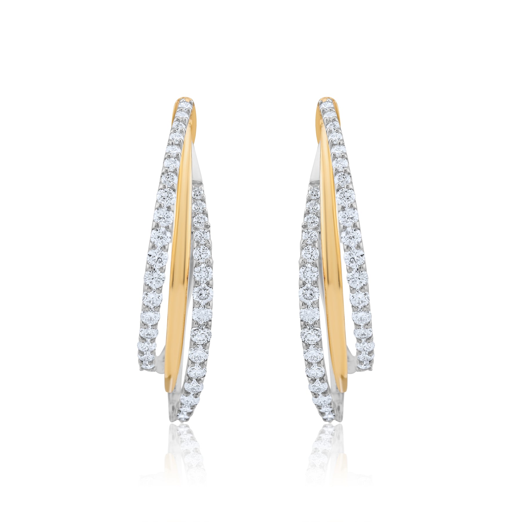 Sleek and sophisticated, these triple hoop diamond earrings radiate modern luxury with their graceful curves and shimmering pavé diamonds. Crafted in polished white and yellow gold, they offer a bold yet timeless statement for any occasion.