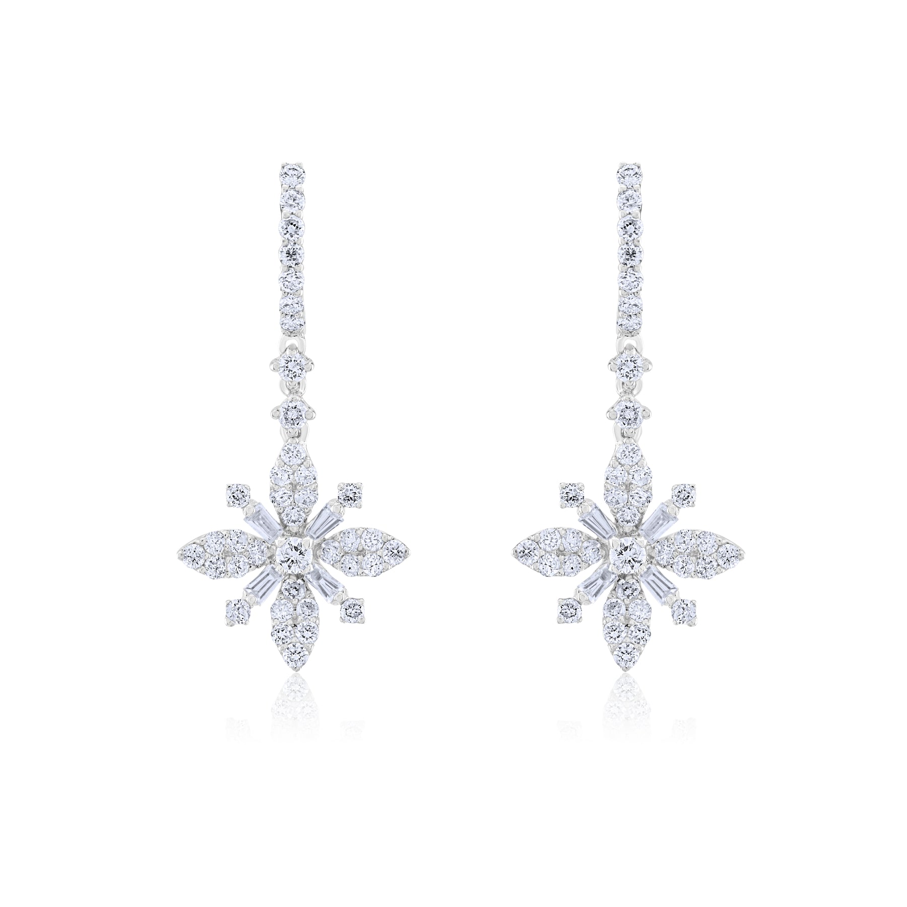 14K White Gold Diamond Floral Drop Earrings 1.52 Ct