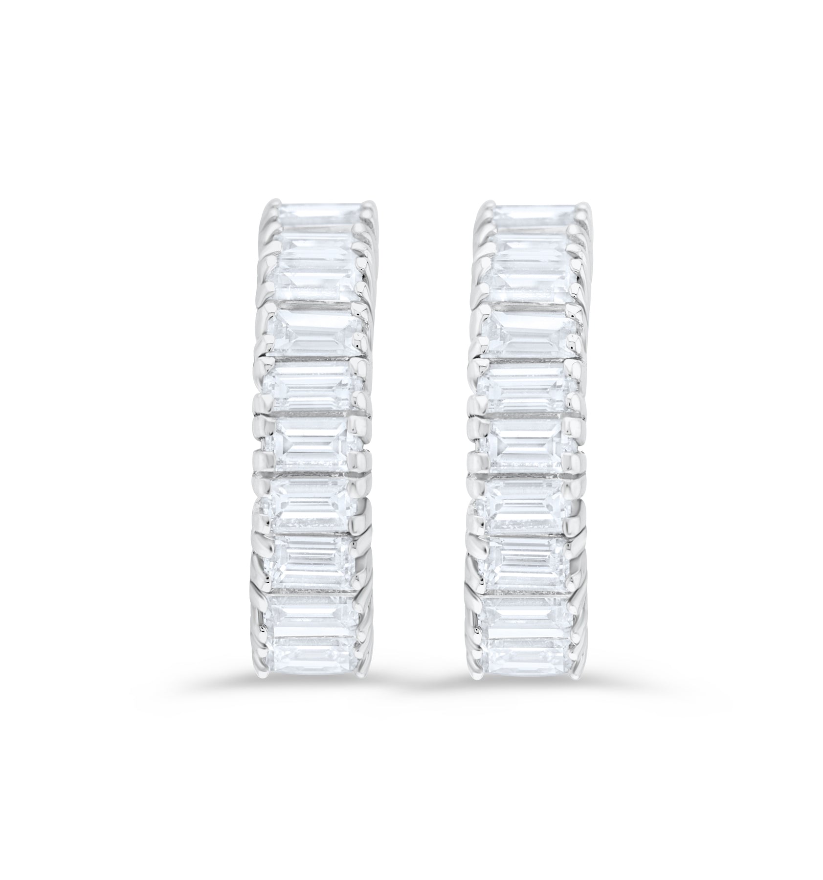 Modern yet timeless, these diamond huggie earrings feature sleek baguette-cut stones that catch the light with every movement. Their refined sparkle and close fit make them a perfect everyday luxury with effortless elegance.