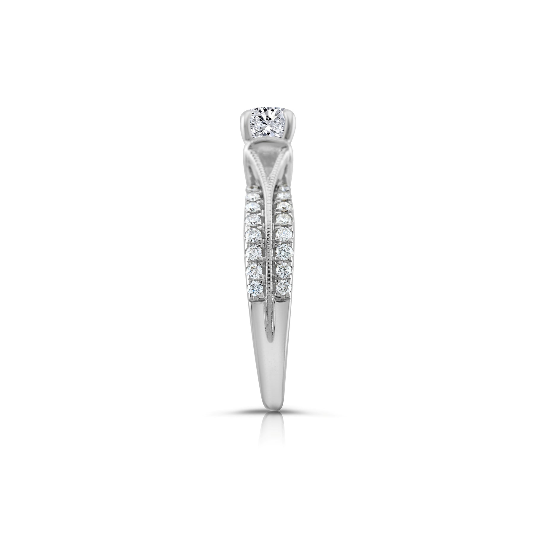A round diamond sparkles at the heart, embraced by a pavé band that whispers with light at every angle. Hidden beneath, a sapphire secret adds a touch of mystery, making this ring a love story of fire and depth.