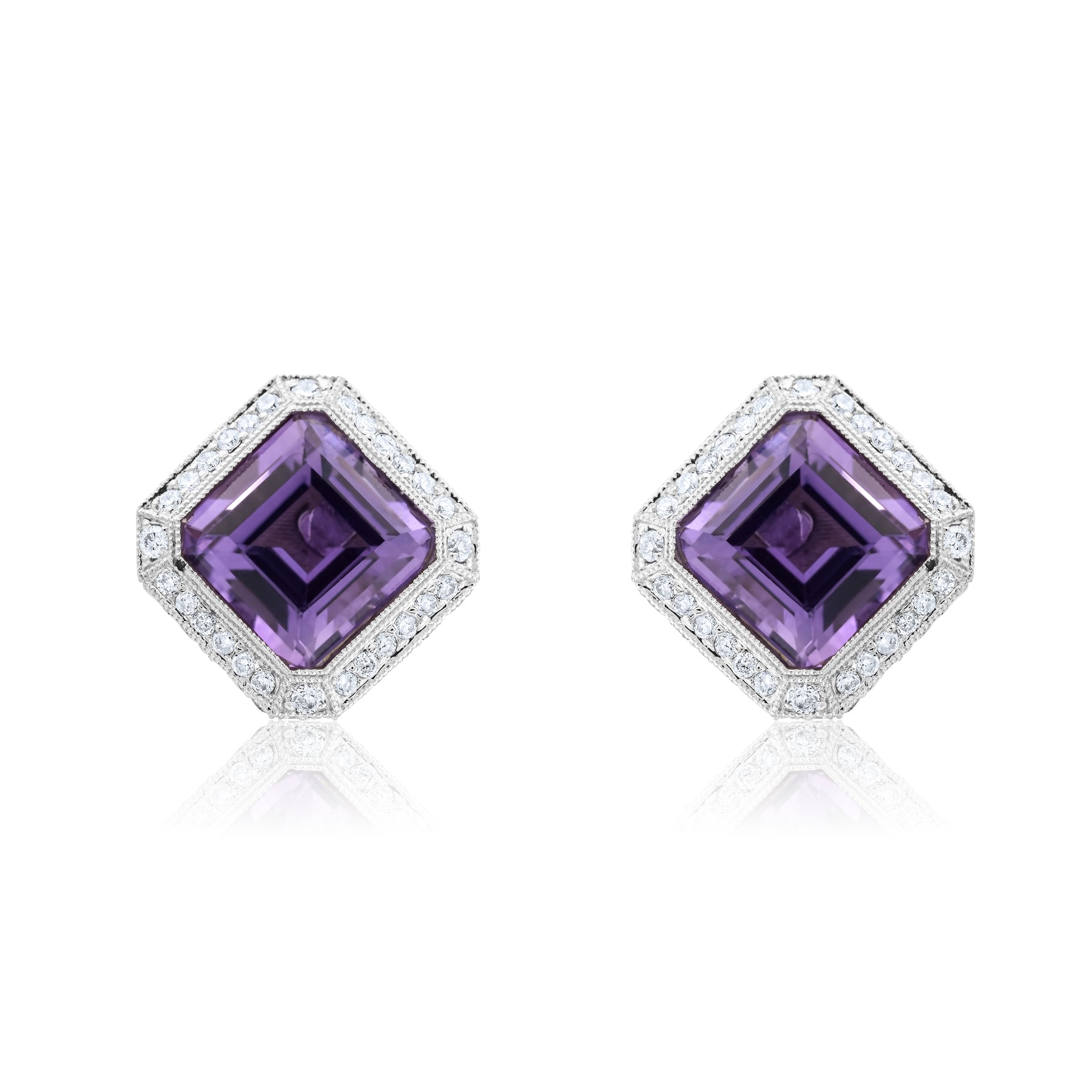 Bold yet refined, these geometric earrings showcase rich amethysts in a striking princess cut, framed by a halo of shimmering diamonds. Their modern silhouette and regal hue make them a captivating statement for any elegant affair.