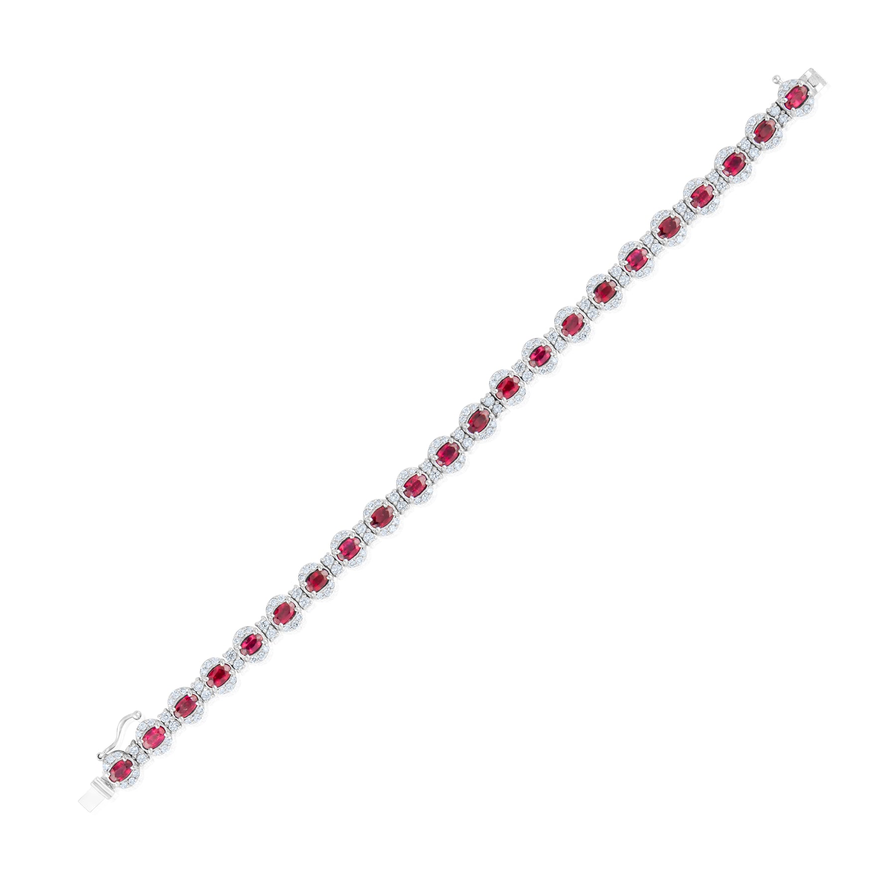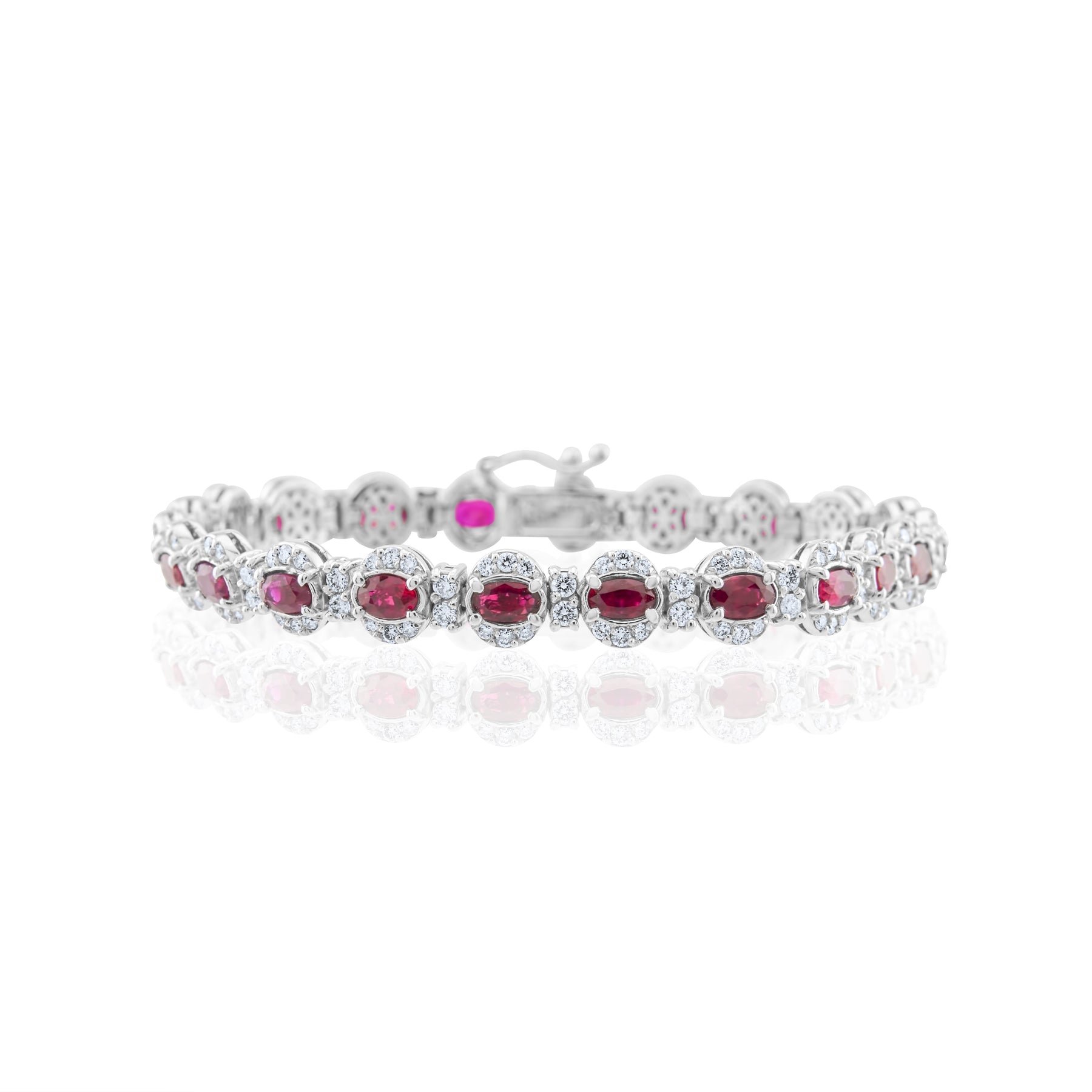 Rich in vintage charm and regal allure, this tennis bracelet pairs vivid pigeon blood rubies with shimmering diamonds in an intricate design. Set in polished white gold and secured with a safety clasp, it’s a timeless treasure that evokes romance and elegance.