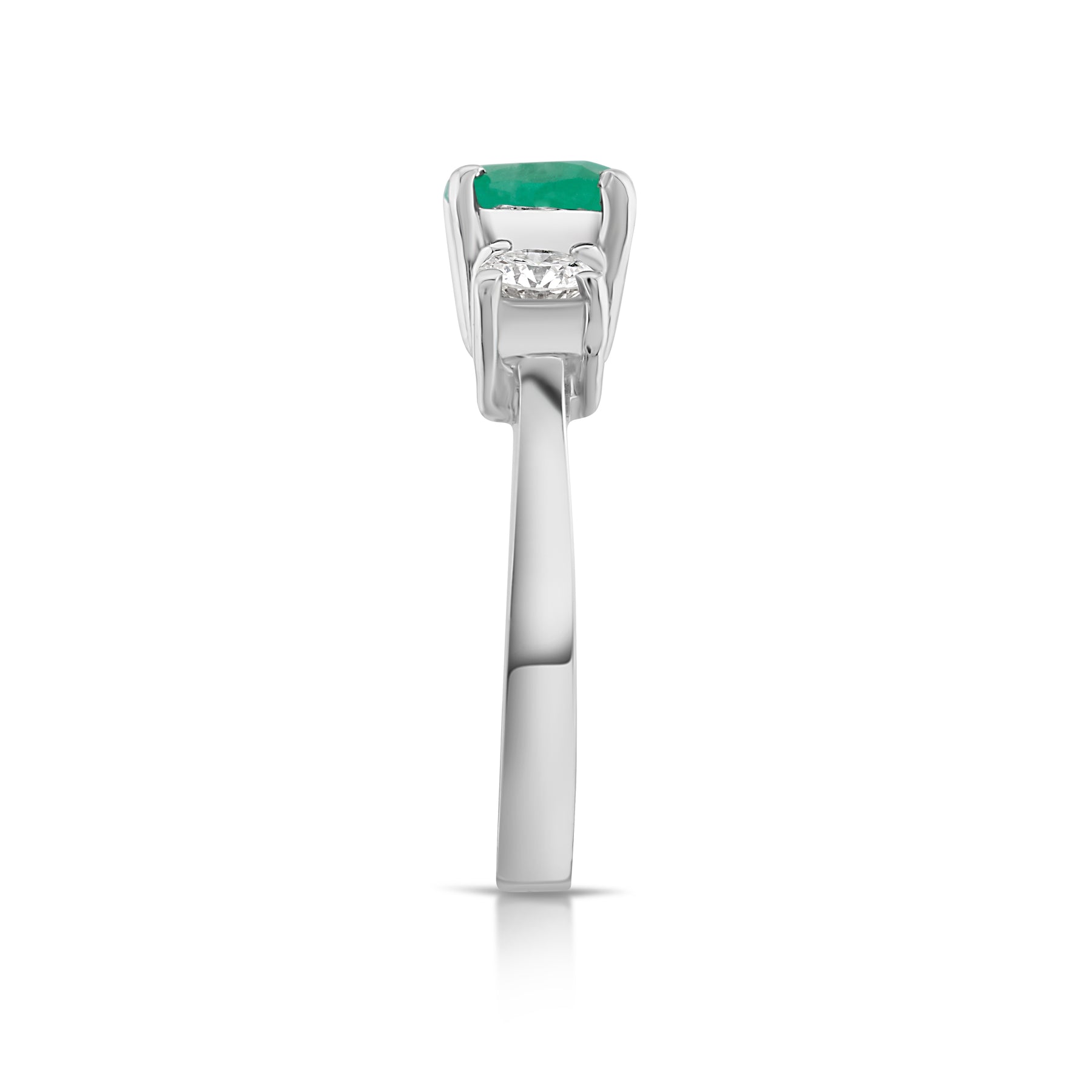 A poetic union of timeless elegance and vivid allure, this three-stone masterpiece captures the luminous contrast between pure white brilliance and the lush green heart of an emerald. Designed for the woman whose love story is eternal, it radiates harmony, devotion, and refined grace.