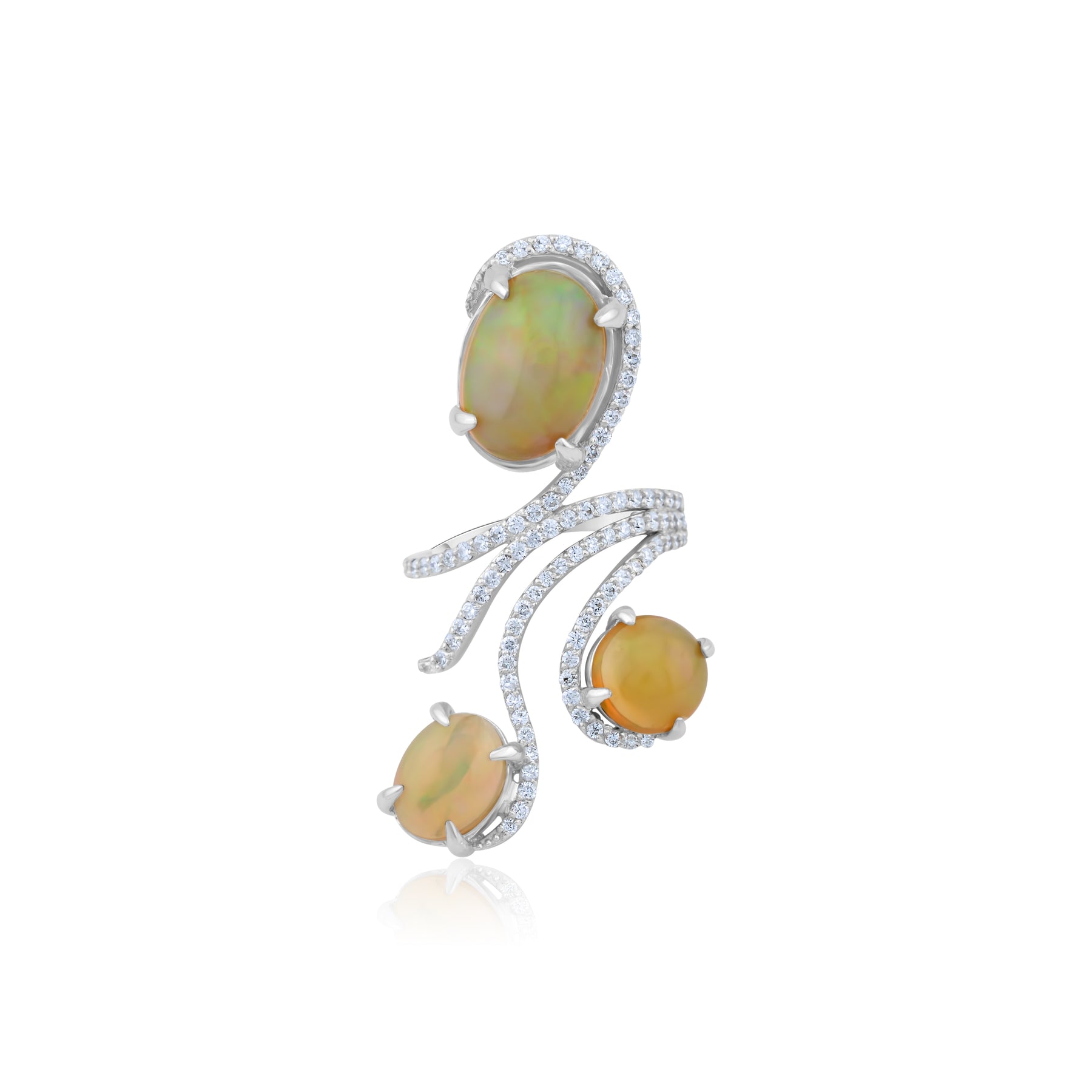 A poetic fusion of light and flame, this mesmerizing ring captures the dance of passion and serenity within every glowing opal. Its flowing silhouette, illuminated by a constellation of diamonds, evokes the elegance of a love that burns softly yet forever.