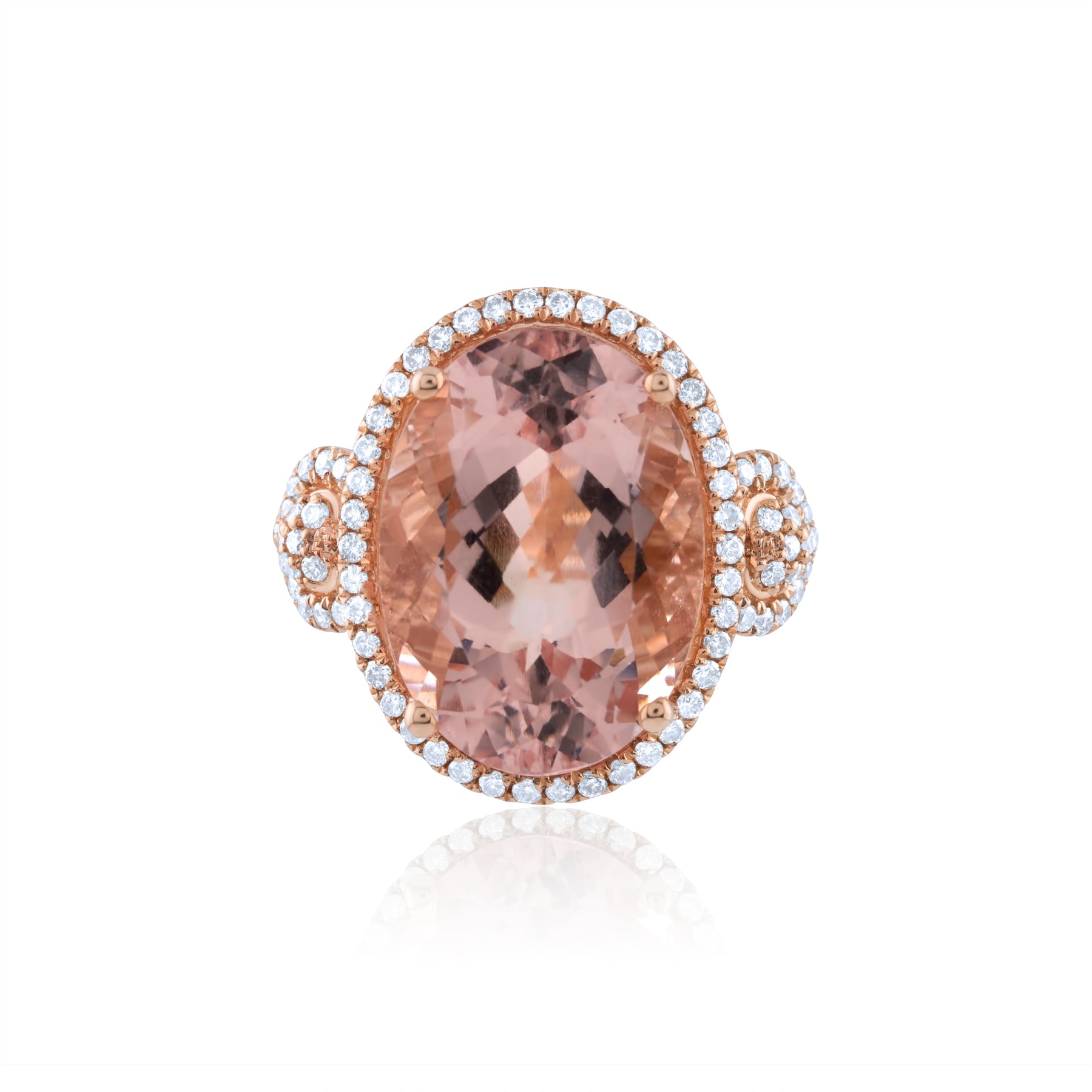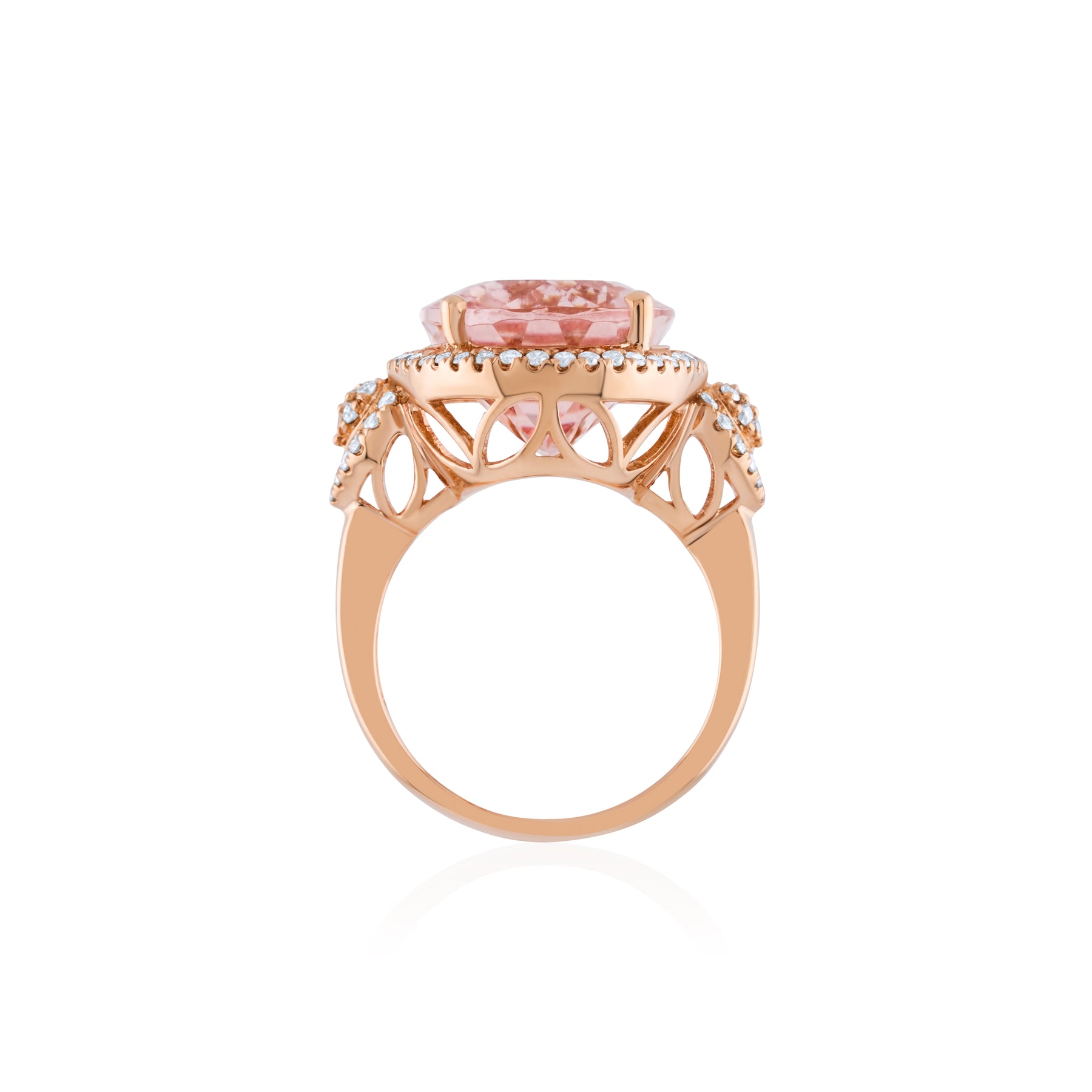 A soft sunrise captured in rose gold — where a luminous morganite glows with tender warmth, embraced by a halo of diamonds that whisper romance and grace.
