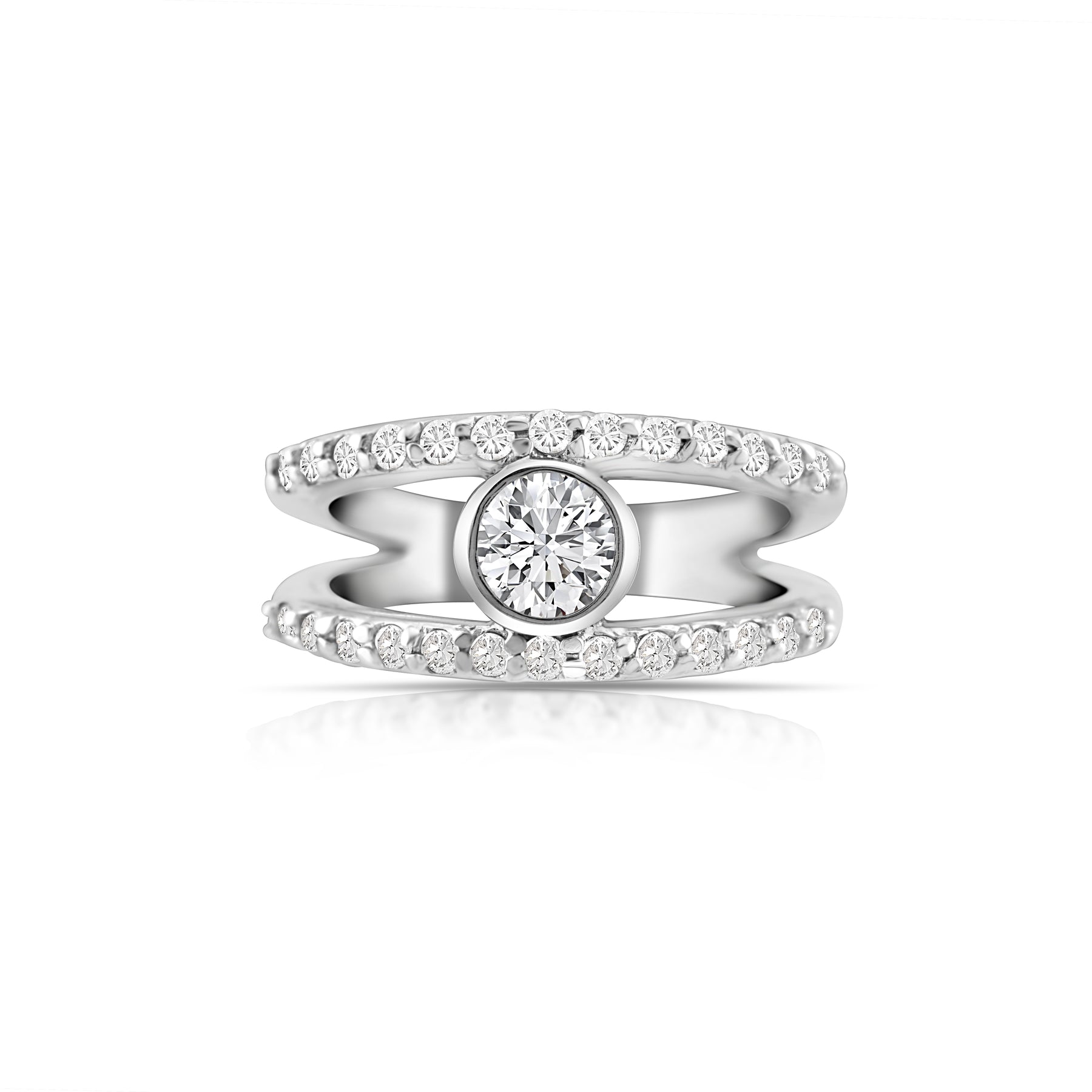 A luminous diamond floats between twin pavé rows, its brilliance magnified by sleek lines and modern symmetry — a statement of strength and grace in perfect harmony.